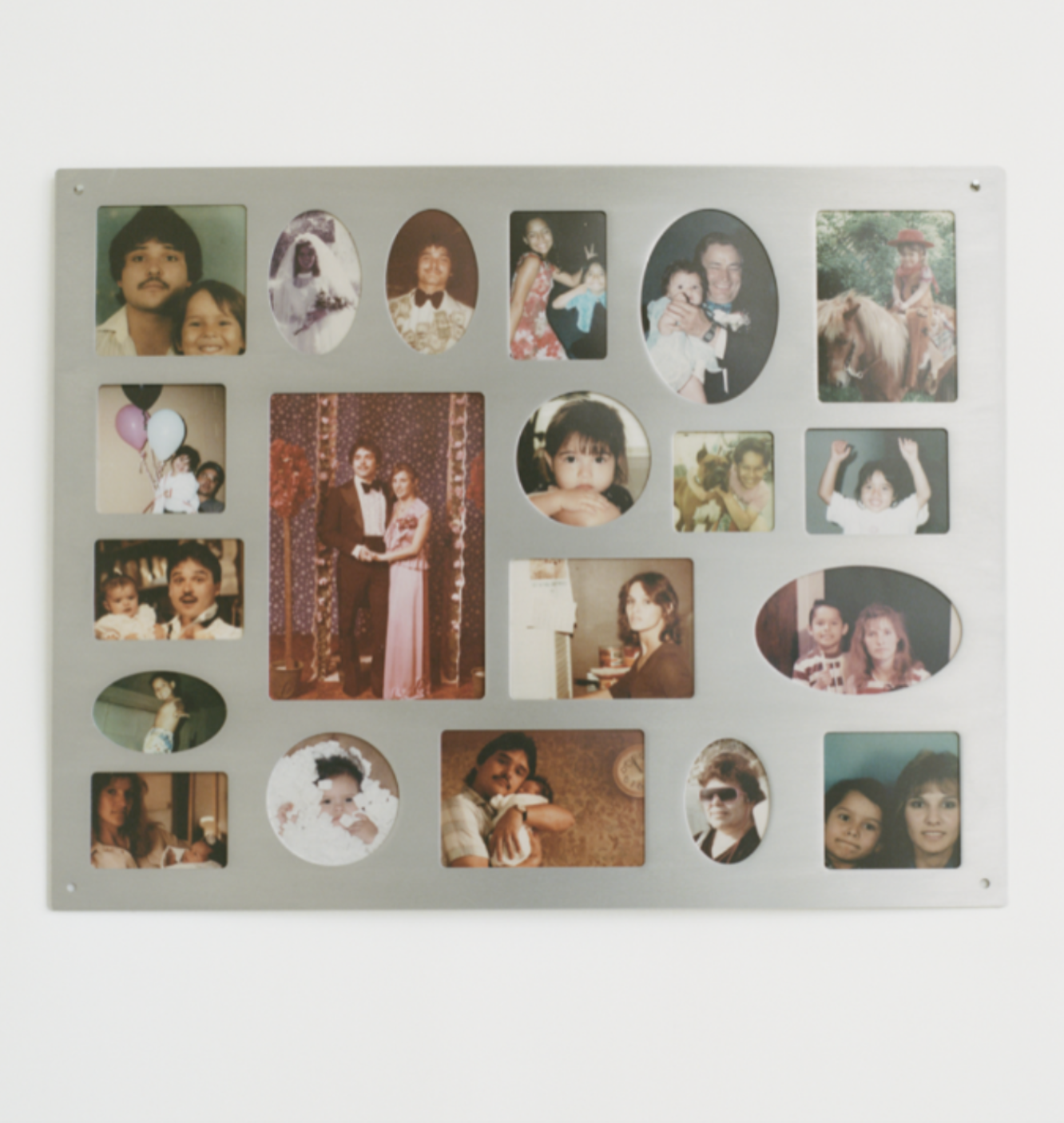 I wanted to recreate that frame in aluminum. I asked four people to send me photos from their family archives, placed them into the frame, and then photographed the piece itself. The project is about nostalgia and the family unit. It feels human and tender, and that will always be what matters most to me.