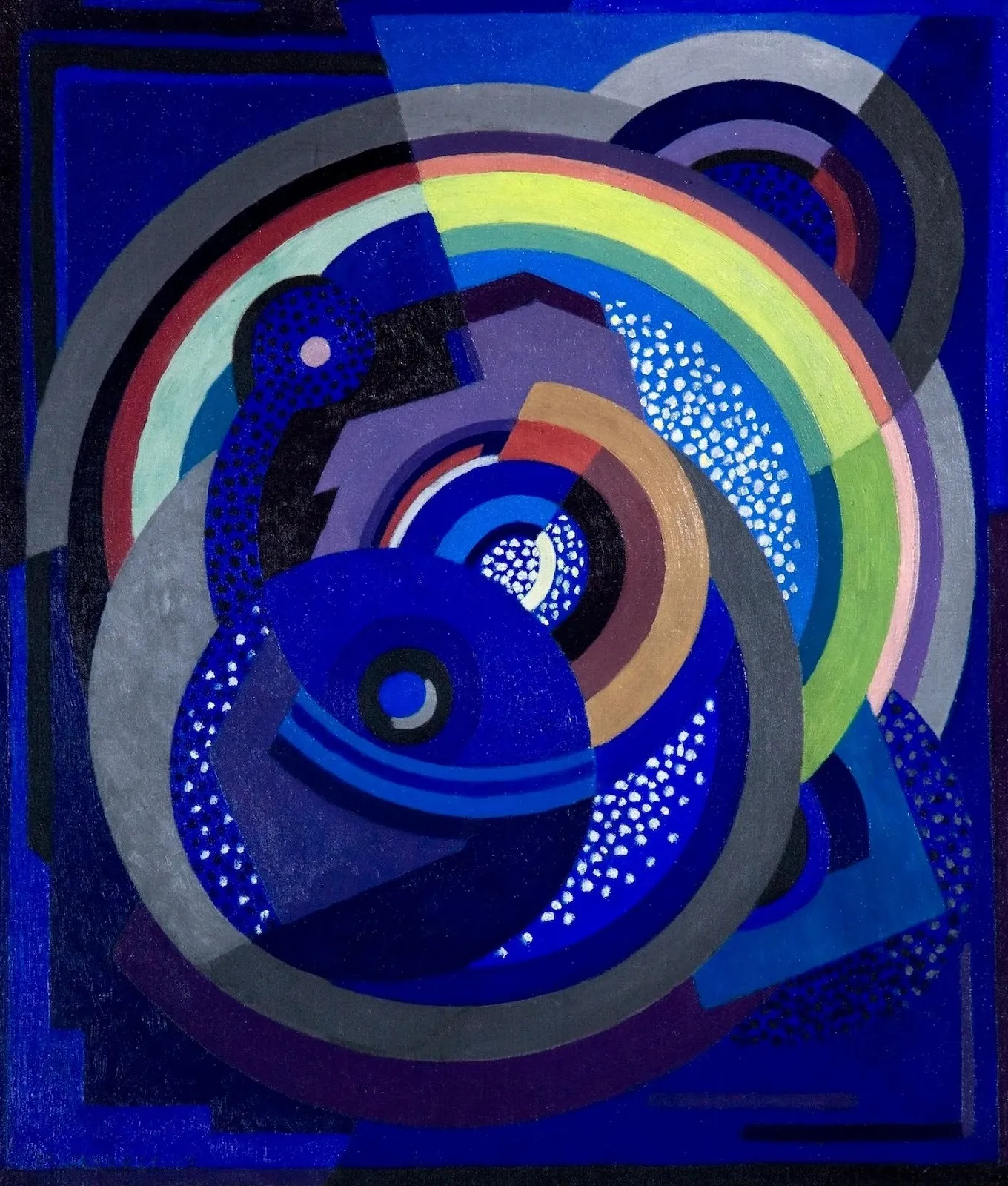 The artist whose work speaks loudest to me in this exhibition is Mainie Jellett: an Irish artist working primarily in the 1930s. Her dark blue celestial canvases, luminous forms, and engulfing voids invoke the spiritual aspects of Orphism. In Jellett’s dark and inviting circular imagery, especially in the aforementioned Painting (1938), the themes of Harmony and Dissonance manifest in stark elegance. While early jazz and other experimental music forms were most contemporary with the work of the Orphists, Jellett’s work speaks particularly to the classical European music that was the referent for much of the Orphists’ visual theories. From counterpoint to color theory, this exhibition reconsiders Orphism as its original creators and participants saw it: transnational, transdisciplinary, and transcendental.