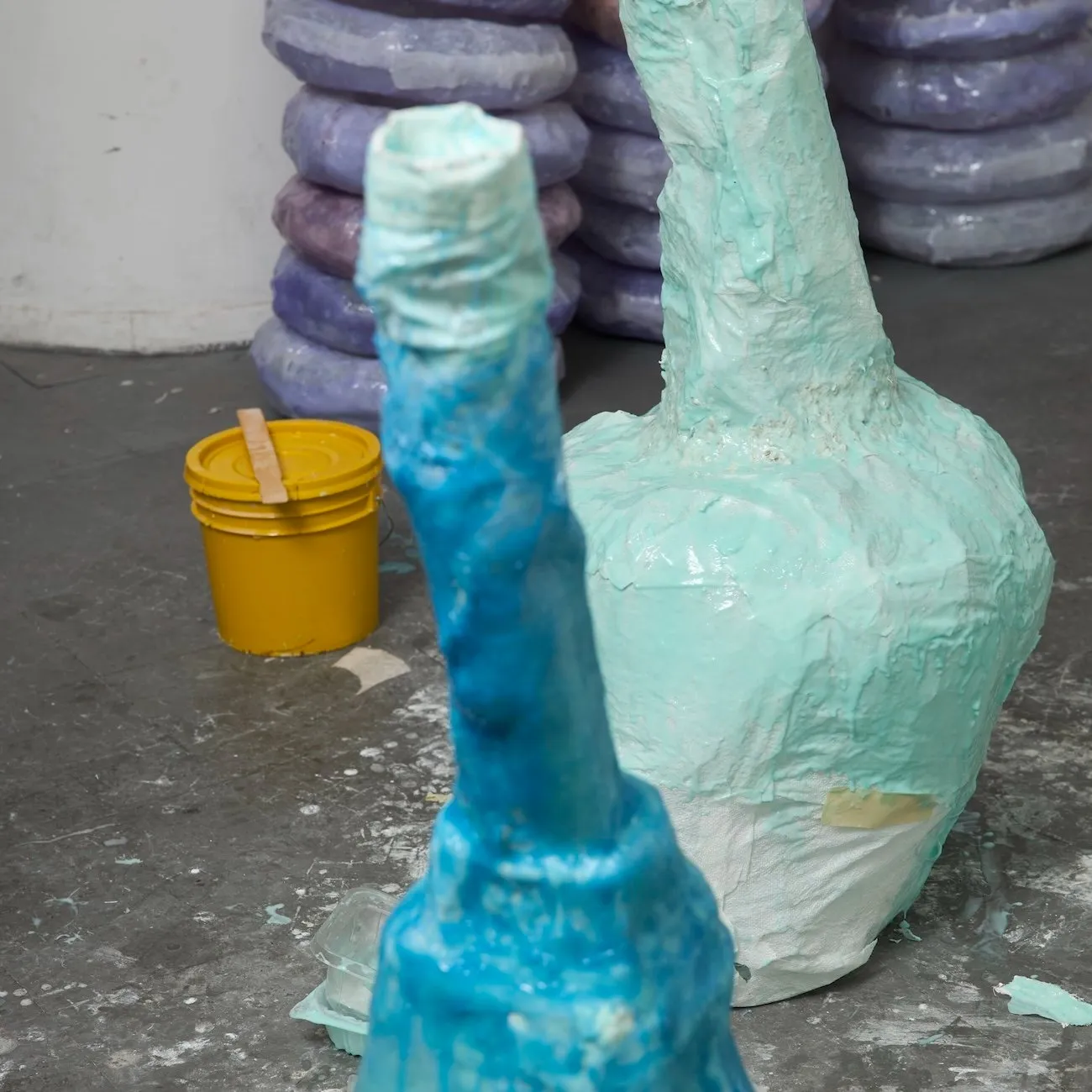 I mostly work with what’s available. I like to pick materials intuitively and experiment, often using them “wrong” with a bit of disobedience. If I’m making a sculpture from scratch, at the beginning, I need things to move fast, so I usually start with paper, glue, and chicken wire. Later, I let the process slow down and see what the sculpture needs, sometimes making molds and casting, and other times casting something directly and reproducing it multiple times. My approach changes depending on the project.