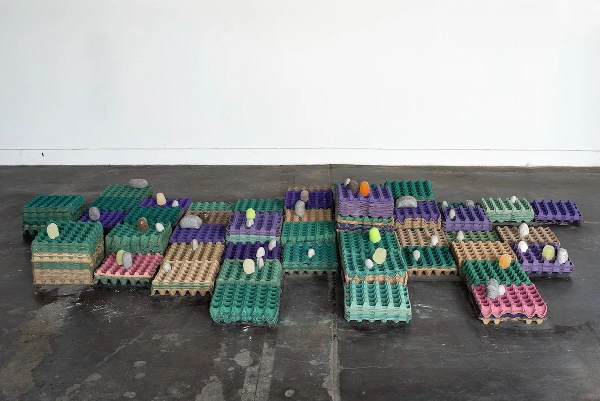 When I work with found objects, they become the material itself. Each carries its own history, and whatever I add becomes part of a conversation with its past, whether it’s dust I’ve collected, rags worn through domestic work, used egg crates, or produce bags picked up in the street or markets. Once those are in my studio, I create a reaction to them by adding components that usually involve some kind of tension, in terms of scale, industrial or organic qualities, or weight.