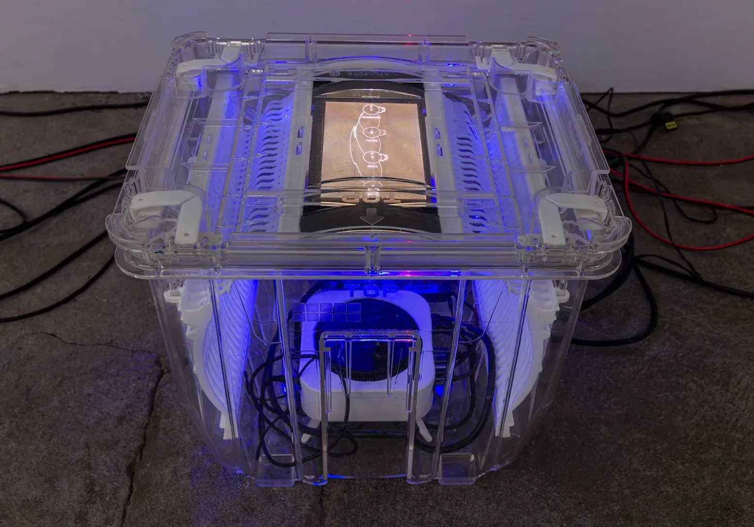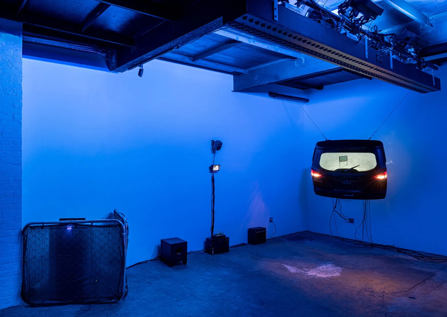 The exhibition, produced by the record label collective 29 Speedway and founder Ben Shirken, aims to make the otherwise sequestered soundscape of data centers—decibels heard only by technicians and surrounding residents—available to listeners in the concentrated space of the cube. Two salvaged Ford Escape hatches hang adjacent to each other at the exhibition’s center, where a series of AI-generated images flicker upon the rear windshields (rendered as a nod to Klee’s Angelus Novus [1920]). The images are generated by a program designed to move through stages of generation and deletion: “accumulate,” “review,” “dwell,” and “purge,” a stochastic and unpredictable cycle of successive images, then erased from the program. Viewers can watch the progression on a screen set in a translucent front-opening unified pod, a container manufactured to hold silicon wafers throughout shipping and production. The images are generated by prompts on broken computers, surveillance imagery, and technological detritus—often the partially-denoised figurations resemble abandoned wiring and infrastructure, a low-res reconnaissance photograph, or a night-vision survey. Each time an image is generated, the windshield wipers are set into motion, ticking to the temporal cues of new compositions to scan; an accompanying sound, a brief tinny crescendo, signals the image’s generation as well.