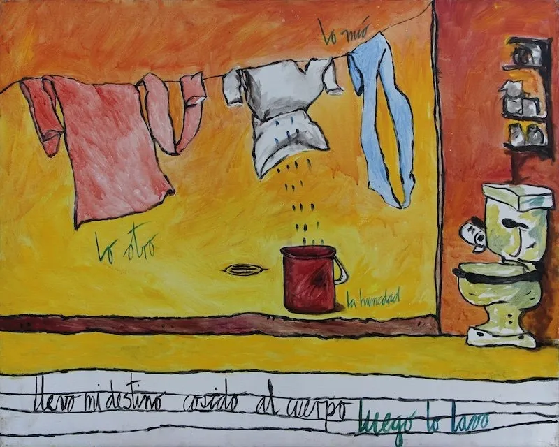 In the middle gallery, Historias de casa (1984–86) and Objetos (1981) expand her vision. No longer confined to her parents’ house, Lara paints domestic objects over bigger canvases, not as still lifes, but as living things. She uses text to inject life into these objects and bring the viewer closer to her feelings. Kettles and glasses express betrayal framed with a “Y yo no te perdono” (“And I do not forgive you”). A bathroom becomes a confession booth. A fridge holds secrets: “Guardé mi infancia en el congelador. Me pregunto, ¿cuándo la voy a sacar? ¿Cuándo la podré comer?” (“I stored my childhood in the freezer. I wonder: When will I take it out? When can I eat it?”). It’s devastating, yet it’s also funny. There’s always humor lurking in Lara’s sadness.