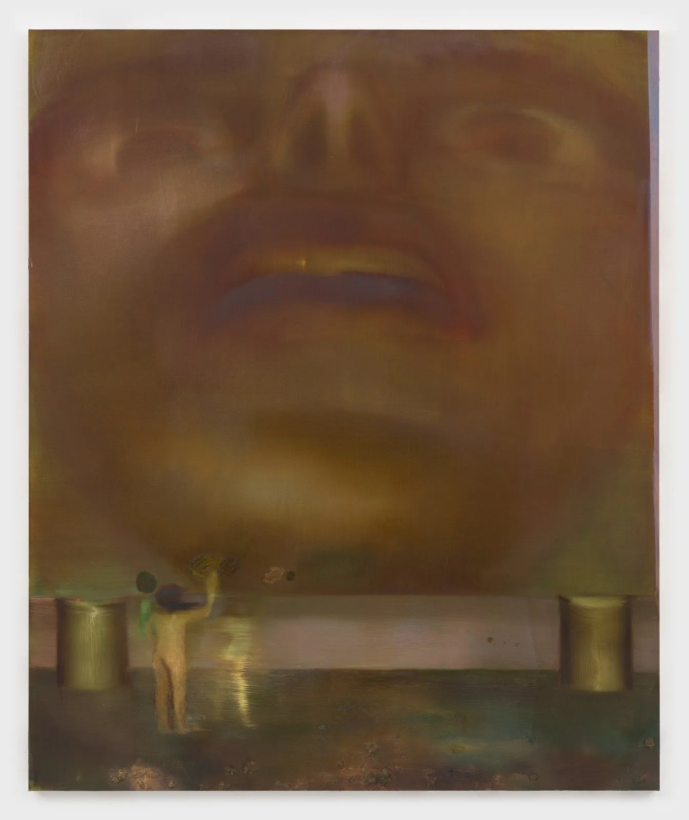 LK: When I was looking at Big Head (2025), I was reminded of Julia Kristeva’s notion of abjection. The figures at the bottom of the painting also remind me of doppelgängers and doubles in relation to Freud’s definition of the uncanny: an unsettling or frightening feeling arising from something familiar that can’t be quite placed, deriving from a repression.