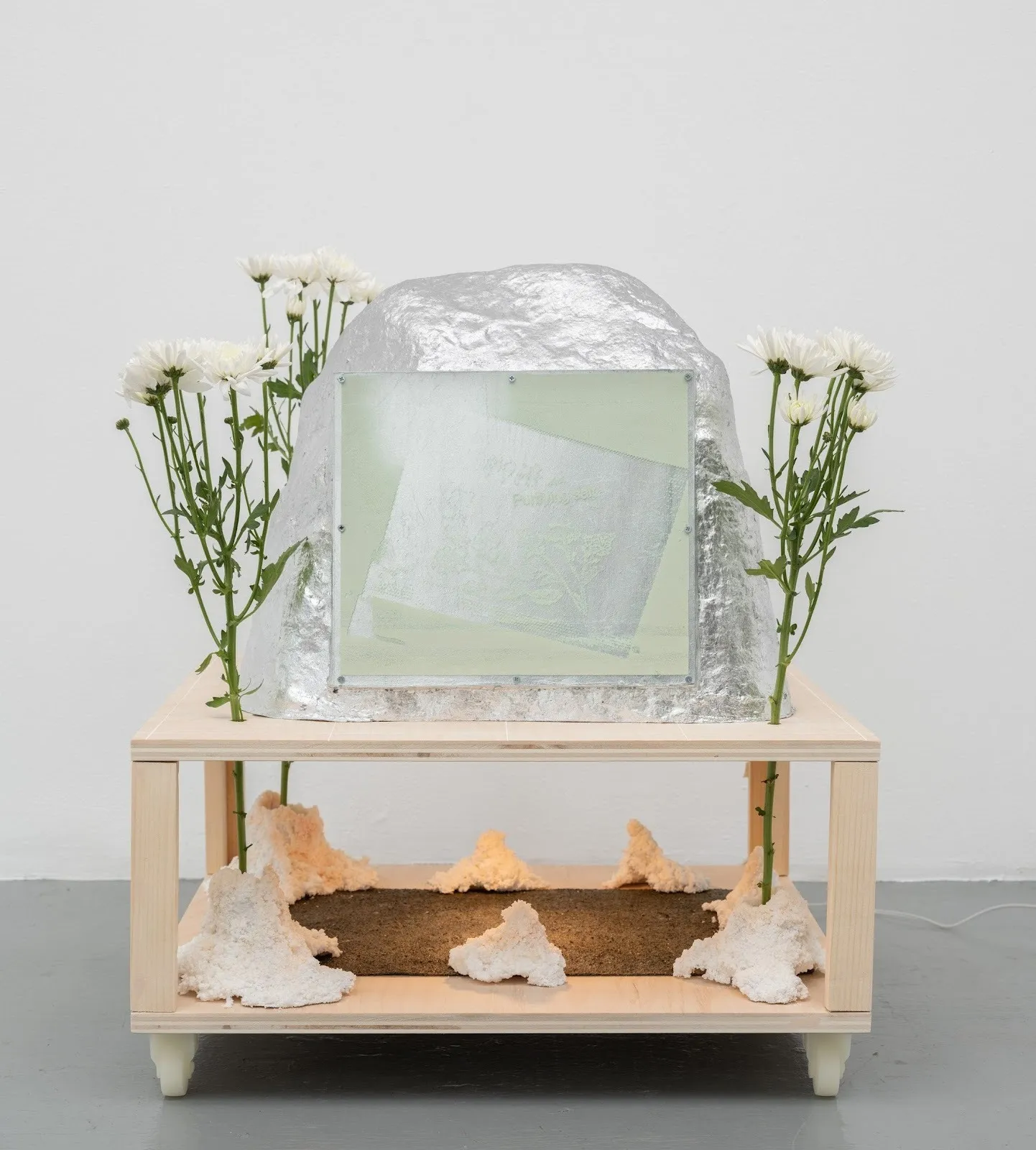 The desire imbued in Japanese American artist Naomi Nakazato’s work is palpable, like how your tongue tingles upon entering a candy store or how your skin prickles when a rush of warm air emanates from an open door on a winter day. Crystalline, melt-in-your-mouth mounds break through gridded, layered canvases; in the center of the gallery, an altar-like form comprising wood, aluminum leaf, salt, seaweed, and chrysanthemums emits an alluring glow from an unseen source.