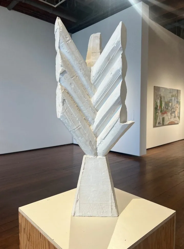 The cast plaster LIFE FORCE OBJECT (2025) appears like a shimmering white fletching—an arrow buried in the ground, its momentum thwarted, left in the ruinous vestiges of a battlefield. Its surface alternates between smooth and uneven, playing between glare and shadow—a contrast heightened by the piece’s angularity. A jagged point on the right gives us the impression it had been broken off, and just above where the base meets the feathers, there’s a subtle, rust-colored spatter as if the piece had been left to oxidize out in the elements. At the risk of losing this remnant of the past, weathered by time with its rough, wind-hewn edges, Tennis has placed it in the CONSERVATORY to save it, immortalizing the sculpture in a place outside of time.