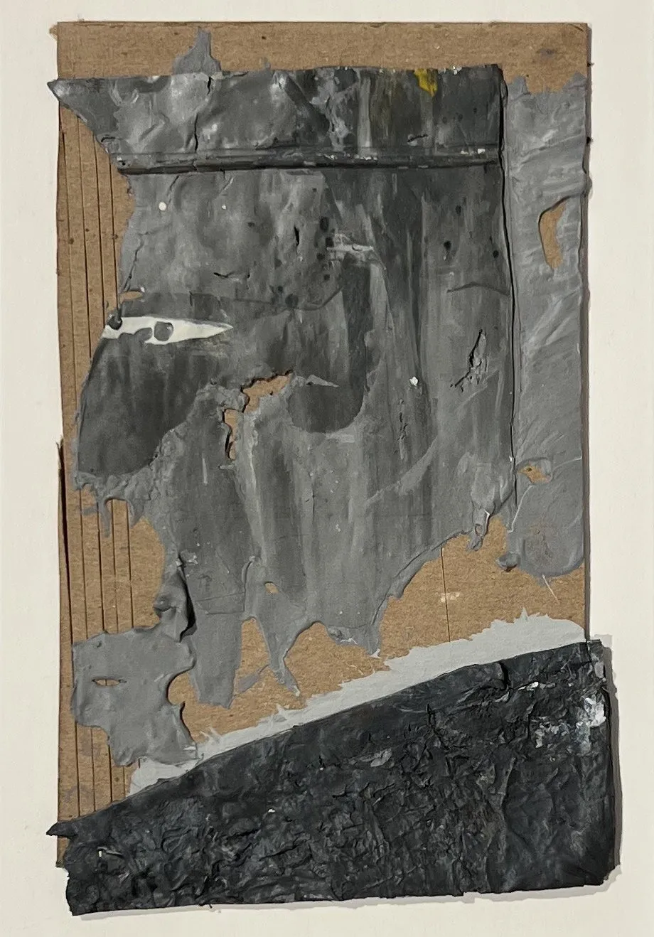 In addition to his larger canvases, Tennis's show also includes several small works, some only a few inches of cardboard. KING (2025) is one such compact, unadorned piece. The cardboard bears hobby knife score marks, and its edges waver slightly here and there as if it had been crudely cut by an untrained hand. It feels questionable if this monochromatic spattering of paint was a purposeful composition or a discarded palette turned into a Rorschach test. At first, it may look abstract expressionist, but the familiarity begins to seep through. You’ve seen this king a thousand times in your life, playing Rummy or Hearts, or maybe Solitaire. The black wedge at the bottom of the card, the distressed materials, and the indistinct profile of the king all tell a story: that the playing card was torn or burnt or lost, separated from its home and 51 mates, now a relic.