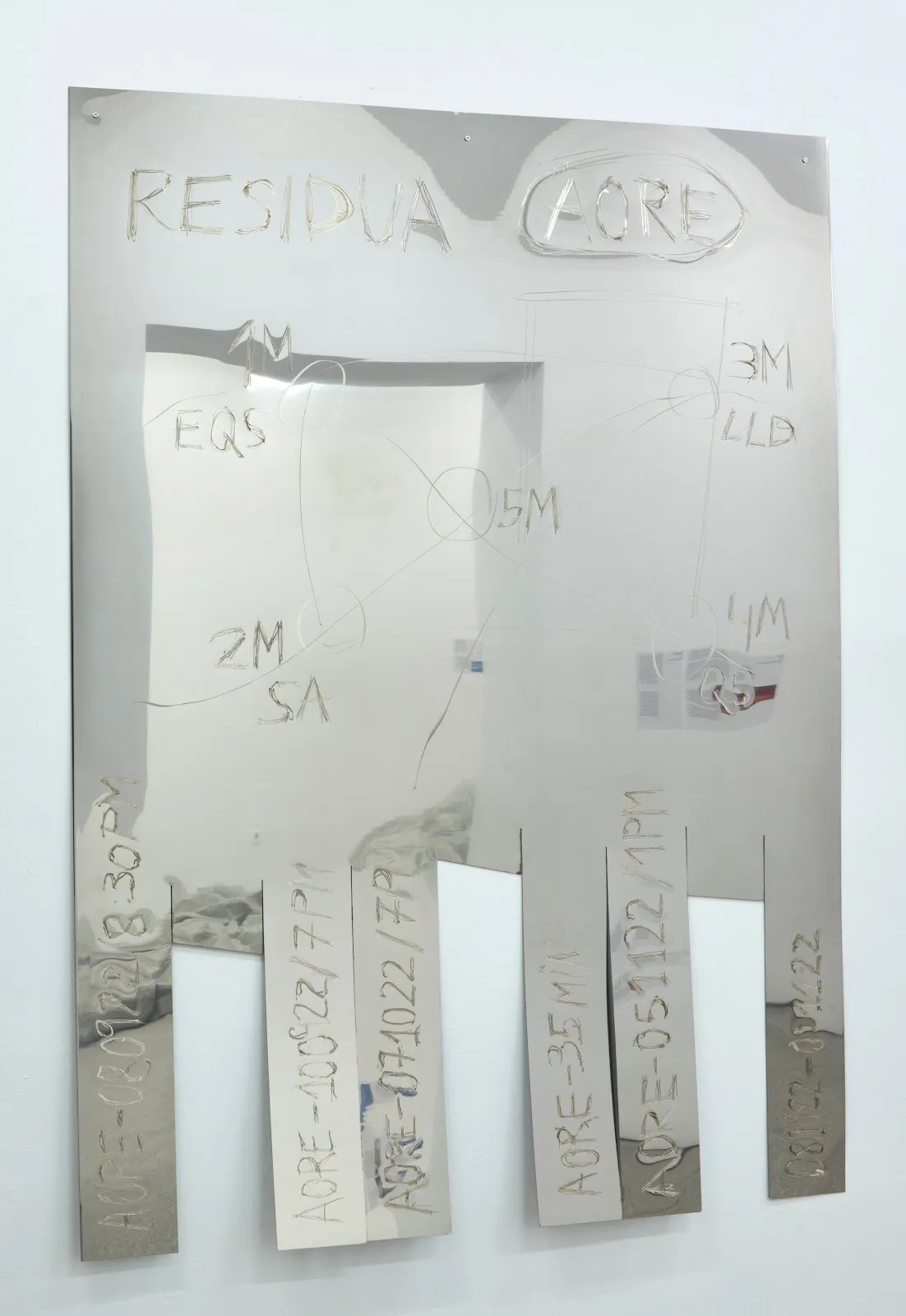 If you get closer to the works, you will notice that some of them are marked with handwritten inscriptions: words, numbers, and scribbles that seem to create a record, or a kind of accountability, of past actions upon matter. This mark-making practice melds together the different media the artist navigates and has been a fundamental element in her work since her early performances. Between documentation and dramaturgy, her scoring configures a choreographic strategy that allows her not only to remember but also to communicate unspoken stories. But the exploration of these “living sheets”[2] goes beyond the gesture of scratching or writing over a bright, polished surface: a sense of virtuality spreads over Estruch’s practice, informing both the formal aspects of her research and her exploration of language and orality. As a collapse in the cohesion of time and memory, an overlap of narratives and cultural symbols, or just as a trace of a previous movement in the space, virtuality always brings some kind of dislocation to the present moment. That which was missing is now breathing, even if it remains vague or evanescent.