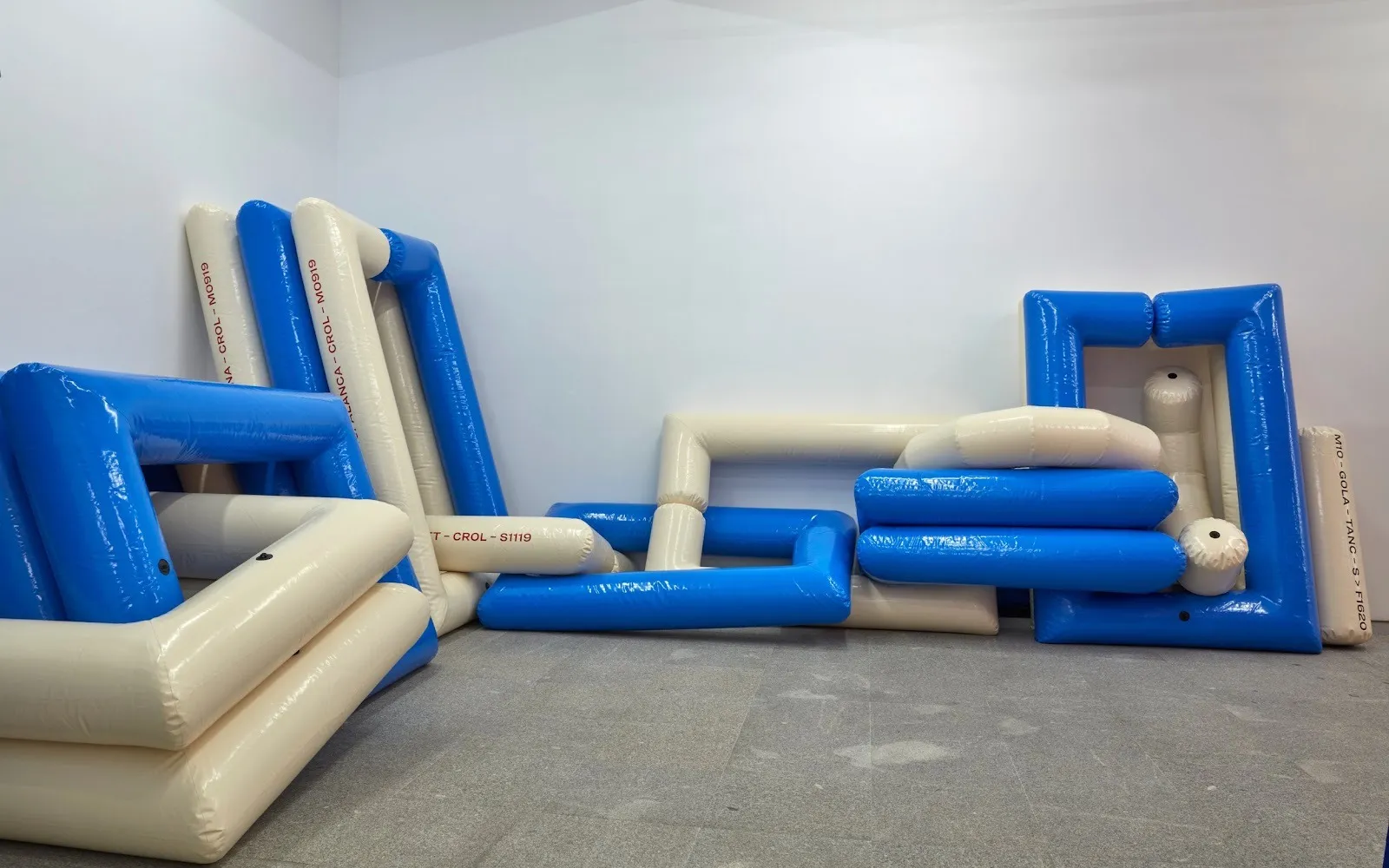 Among the twenty-seven works shown in the exhibition, a selection of sculptural pieces—initially thought of as stage designs by the artist—spread industrial, playful imagery across the space. As if a kid’s modular game had expanded tenfold, overflowing from the realm of imagination, these monumental works highlight the predetermined nature of the contemporary scenarios we enact. Out of scale and context, in a concatenation of apparently fixed positions, they seem to expose the inherent performativity of our social machinery, revealing the plasticity of the patterns we reproduce daily. But something else is missing—these pieces aren’t just waiting until the next reenactment. Some of them have changed in shape, appearance, or position since they were first manipulated; some of them contain whistles, melodies, and screams inside a structure that just appears to be silent. Estruch’s formal research aligns with the political understanding of infrastructures as interconnected living networks. Often invisible within a seemingly stable order, these networks open up possibilities for resisting its systemic, oppressive dynamics.[1] Her sculptural installations are, therefore, ephemeral architectures that carry a political agenda. Whether they are theatrical fantasies or living bodies, they are not structures, but infrastructures: they are always in the making, always exceeding the memory we hold of them.