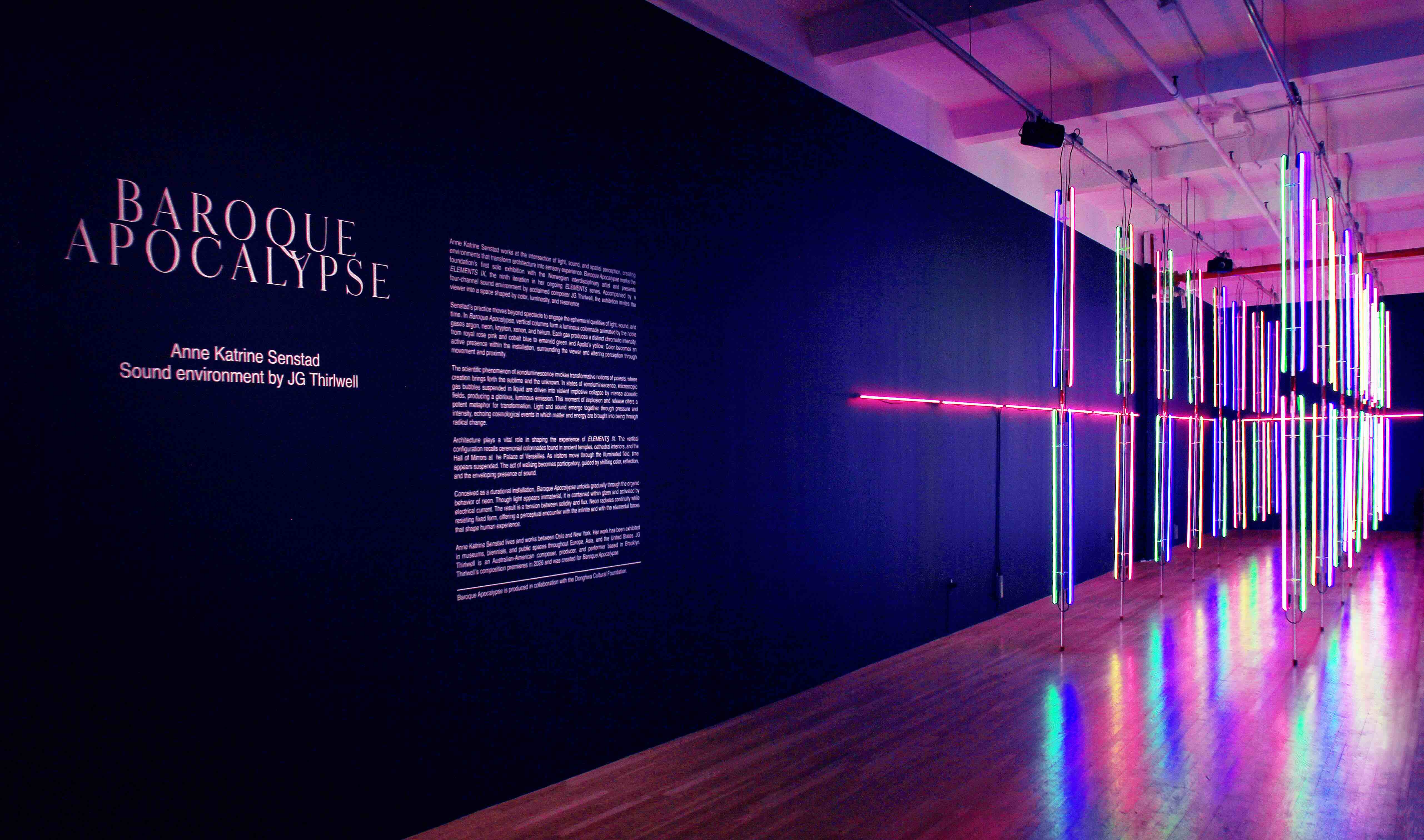 Baroque Apocalypse features two components: a large-scale neon light sculpture, the ninth in Norwegian interdisciplinary artist Anne Katrine Senstad’s spatial neon series ELEMENTS (2018–); and a four-channel sound environment created for this installation by the renowned composer and longtime collaborator JG Thirlwell. Together, they operate as interdependent forces that guide the viewer’s sensory and temporal experience. The installation’s neon elements radiate a subtle, nearly imperceptible stirring to form a structured but intimate luminosity that seems to hover between physicality and illusion. The accompanying soundscape amplifies this effect, with its low tones resonating with the viewer’s bodily rhythm and echoing the gentle pulsations of the neon gases themselves.