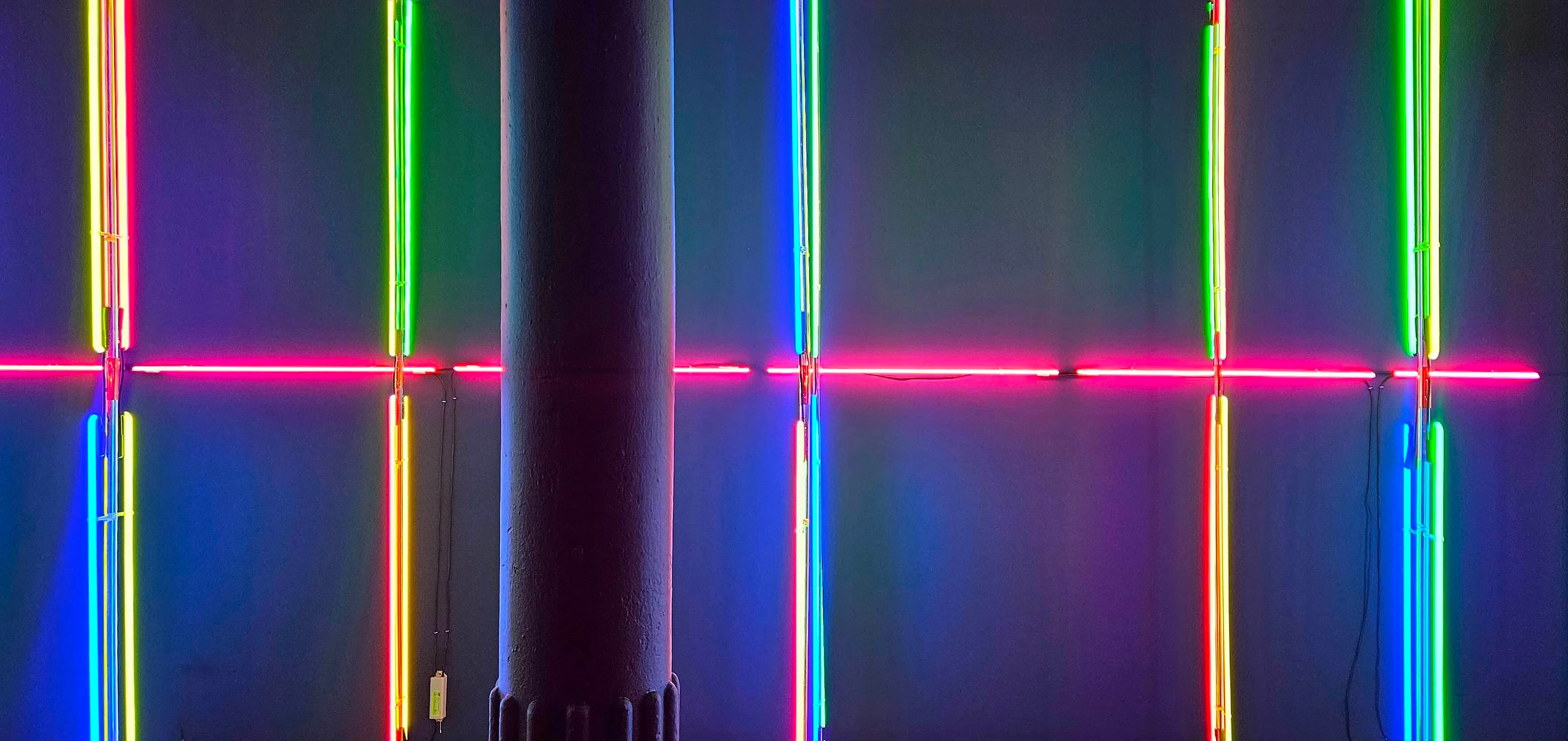 At first glance, the work appears restrained. Delicate neon tubes are arranged in vertical columns, tracing lines of color through the space. This initial sense of stasis and the synthetic register of neon light are deceptive. Only when you move through and around the structure do you slowly notice the elemental nature of neon’s noble gases, softly colliding and releasing energy that emerges as a faint, rhythmic pulsing of light so subtle that it nearly slips beyond recognition. As the eye adjusts and the body begins to synchronize with this nuanced modulation, the colors seem to breathe along with you. This shared rhythm produces a curious intimacy between the viewer and the work, collapsing the distance typically maintained in a gallery setting. This sense of intimacy is deepened by the installation’s sonic environment, an immersive envelopment of sound that feels as though it is meant to be internalized by a continuous field of resonance.