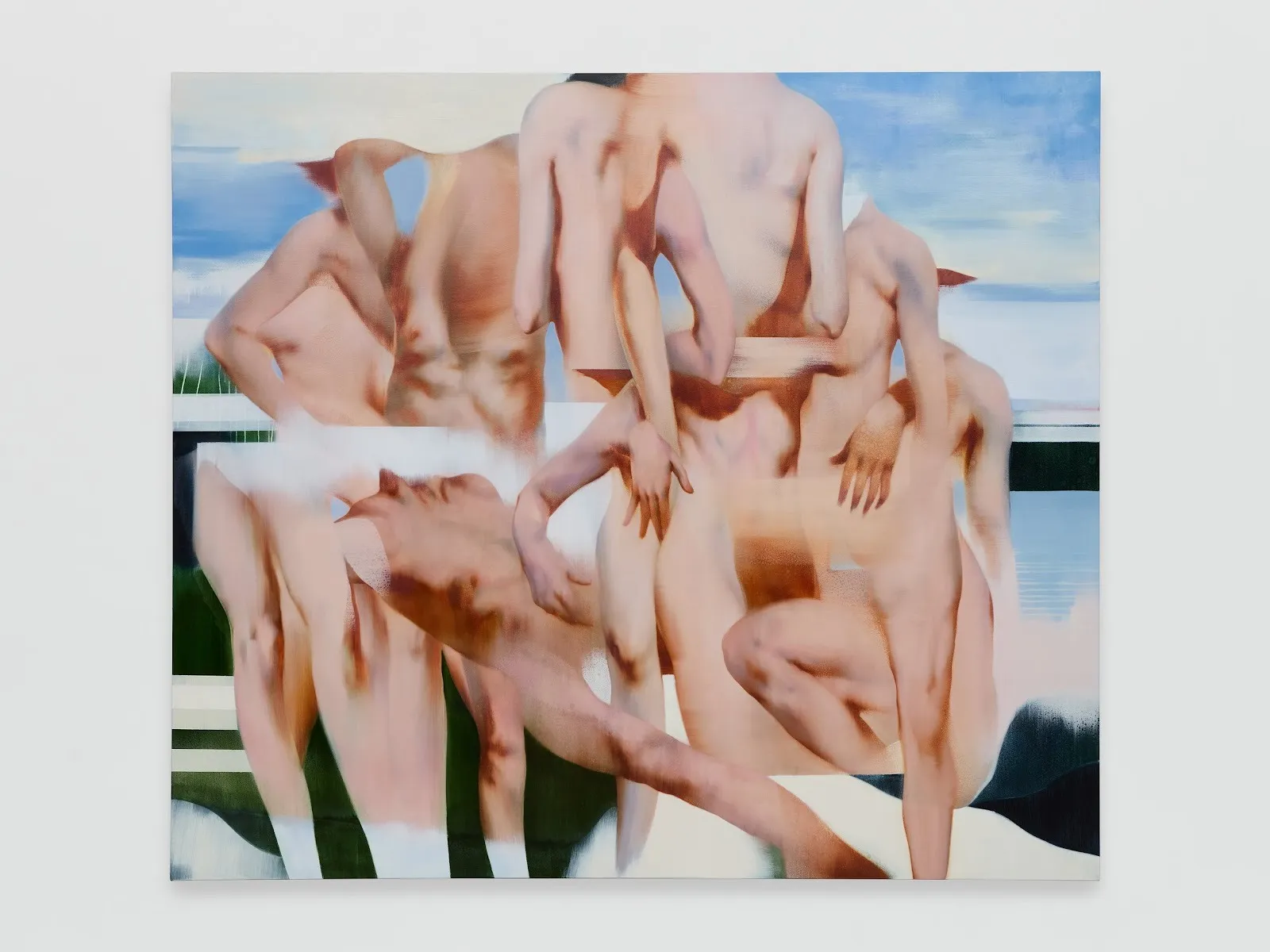 Then there’s a painting like Parade (Masstige Paradise) (2025), more starkly segmented into quadrants and with more crisp distinction between forms. In this echo of photomontage, the bodies are caught in different shades, occupying disparate moments in time in a day, in history. In some, the scale of each figure is distinct, a magnified torso proximate to a smaller head. Do they know each other? The degree of their contact is elusive, even as the gestures of hands and limbs often suggest intimacy and eros. At times, a painting can seem to capture a single body—both a particular and an ideal—in successive motion, akin to multiple exposure or a transposed futurism. Rush is like this, in which the figures seem to fan out from each other, caught at stages of evolutionary development and culminating in a kind of final form.
