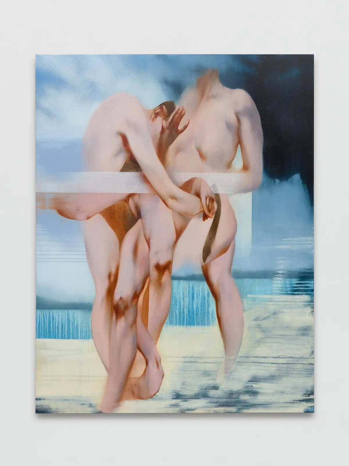 This is not to say that there aren’t “glitches,” so to speak—in Rush (2025), one might think to peer into the more jarring segments of white and wine-dark sea, layers of depth behind the figures. In Out of Town (2025), the thin, dripping streaks run in paradoxically horizontal lines, bringing the edges of legs along with them. In Trust fall (2025) and Facade (2025), translucent panels interrupt the continuity of scenes, like screens in between bodies. The acetone mixture Kostov applies to still-wet paint produces an effect akin to rust or the irrevocable decay of analog film; stretches of cellular dissolution perforate the otherwise ethereal contour of muscle and shape.