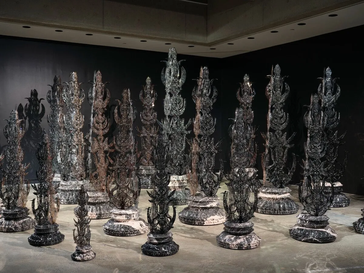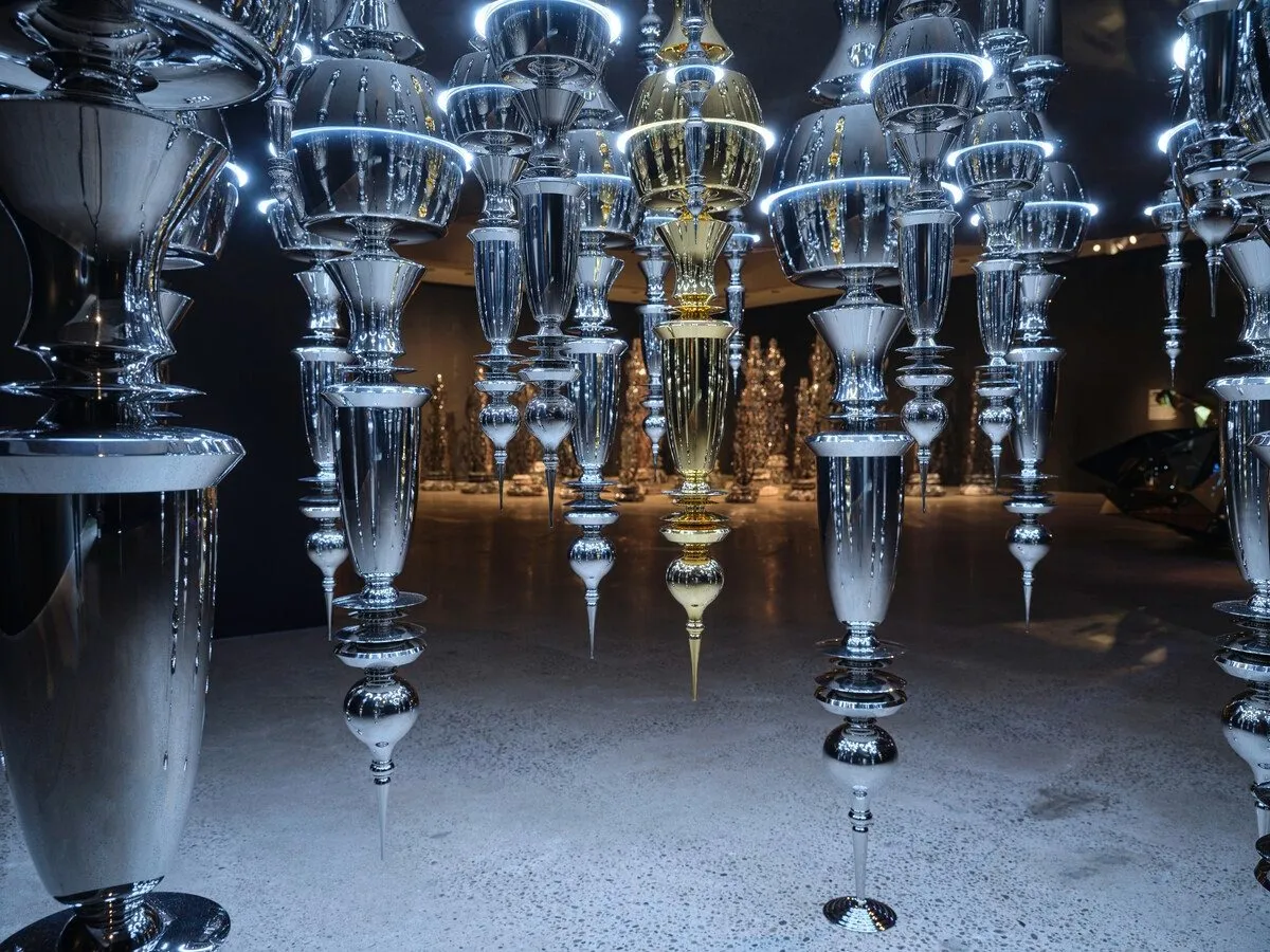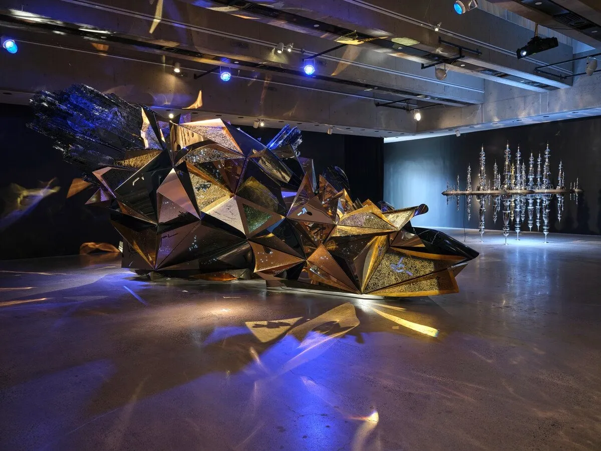 At first glance, Odyssey (2025) appears to be suspended, floating in space. A ridged beam curves around the middle of the piece, reflecting mirrored scenes of protruding steel towers akin to Islamic minarets or Renaissance spires. Made of stainless steel and 24-karat gold, the sculpture draws on spiritual cartography, elegizing a microcosm of architectural extension into the earth and sky. One might imagine walking through the towers of mirrored steel and feeling dwarfed by grandiosity—not least an ode to the divine practice of engineering, and a scale model of a world that exists elsewhere.