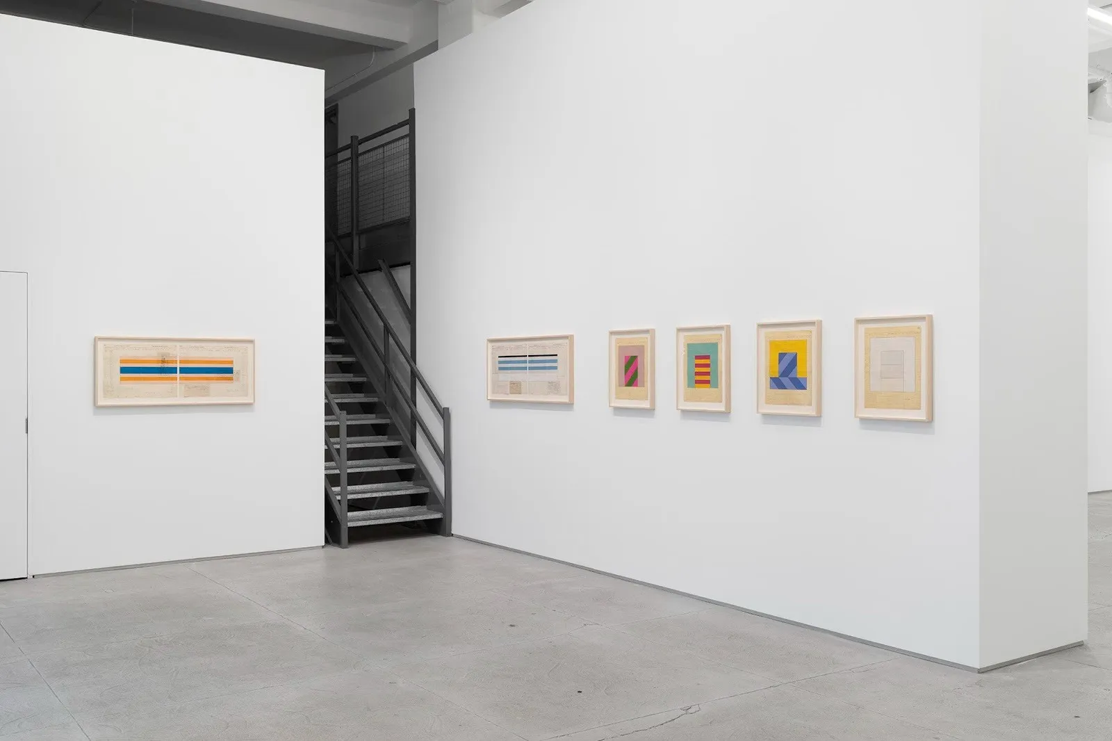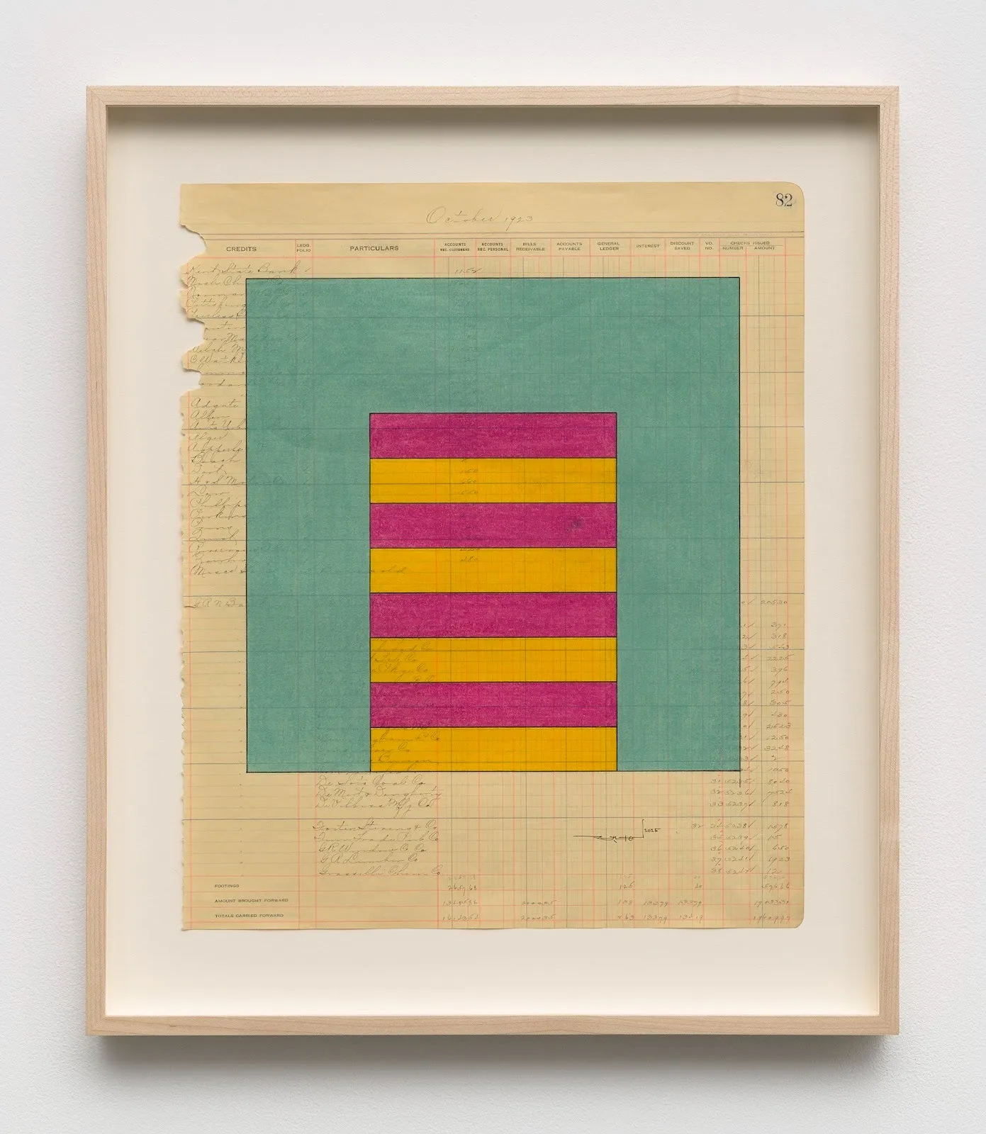 A Powerful Place, Is A Diverse Place; The Above World Brings About New Thoughts; Important Ideas Come Into Existence; Connections To Be Made On Each Trail—thus read the declarative titles of Terran Last Gun’s immaculate drawings in his current show, Visual Reaffirmation at Chapter NY. Their names speak to a journey both physical and psychological: movement across oceans, through history, and along the modest page. Carefully stacked with gem-like shapes to form something like stained glass windows, flags, sunrises, or road signs, each work marks an epiphany or an arrival. The paper used is pre-printed with pink-blue grids, strewn with anonymous handwriting: antique ledger sheets, in many cases dating over 100 years old.