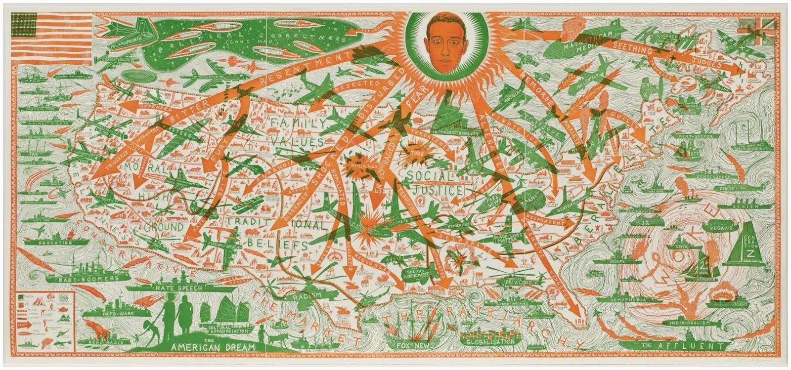 I saw some beautiful prints in the editions area. At Paragon Press out of London, there was an apocalyptic Grayson Perry etching, The American Dream, illustrating a map of the United States being attacked with an intricate array of battleships, airplanes, helicopters, zeppelins, and missiles, representing the present-day culture war taking place online through social media and advertising. It adequately portrays the inside of my brain every day for the past few years. Tamarind Institute, based in Albuquerque, New Mexico, featured a radiant twelve-color lithograph by Los Angeles-based artist Jarvis Boyland. His intimate portraits of queer Black men in domestic settings explore the complexities of identity. Stippled with deconstructed anxiety, his conveyance of flesh, pattern, and environment rattles like an alluring sea of flicker discs.