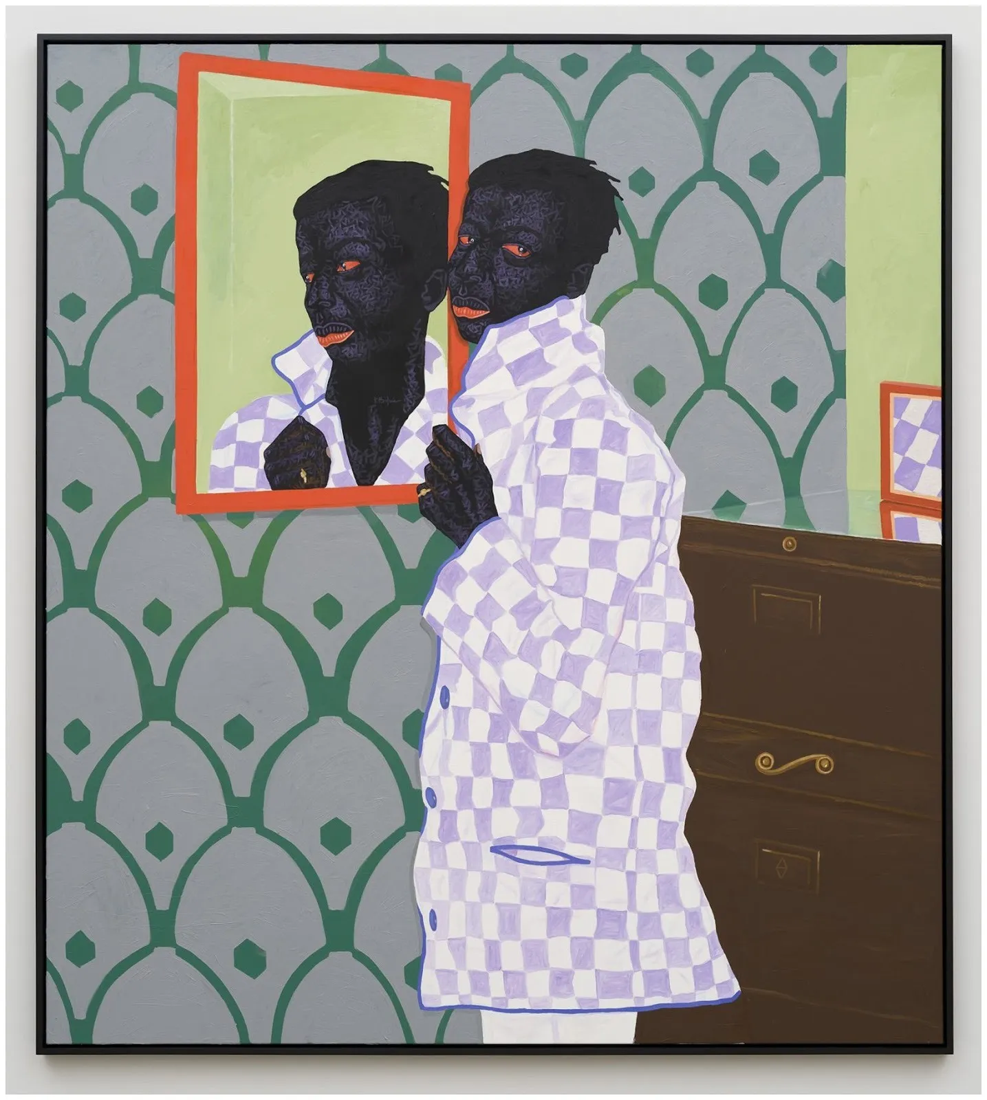 Kwesi Botchway’s work made appearances at Vielmetter and Maruani Mercier. Based in Accra, Ghana and initially influenced by Ghanaian street art, his recent works blend European painting techniques with African Realism, owing significantly to the pioneering work of Kerry James Marshall. However, compared to Marshall and the aforementioned artists, Botchway’s figures appear more guarded and maintain a detached majesty. The subject seems to know they are being viewed and scrutinized, but will not honor such intrusion. His perhaps metaphoric use of mirrors in the compositions suggests a rejection of performing for the white gaze, implying deflection as well as duality, while yielding a double portrait. His use of color and pattern is well-chosen and highly effective, especially in the extraordinary treatment of highlights reflecting off the skin.