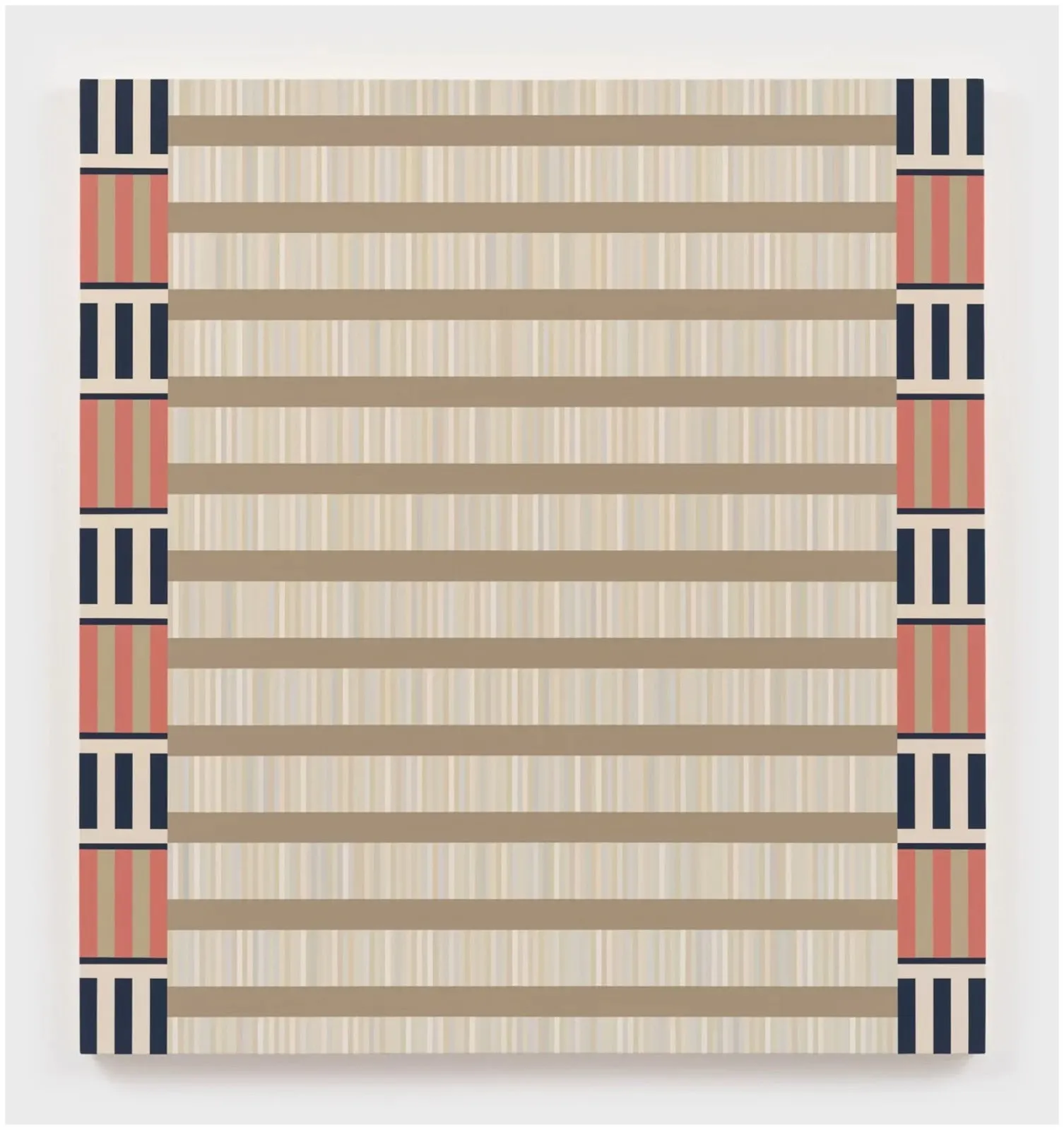 Hales Gallery featured the work of Jordan Ann Craig, who lives and works in Sante Fe County, New Mexico. Her large-scale paintings, formatted primarily in grid structures, utilize color, pattern, and interlocking forms in an exploration and interpretation of Northern Cheyenne and Cheyenne material culture while putting forth questions and creating a dialogue with modern abstract painting—most directly that of Agnes Martin—and its relationship to Indigenous culture. Craig’s line and pattern work appear to be more academic and consciously scrutinized, surgical in comparison with the soft and unplugged ethereal quality of Martin, hinting to Craig’s research-based practice that begins in museum collections and archives.