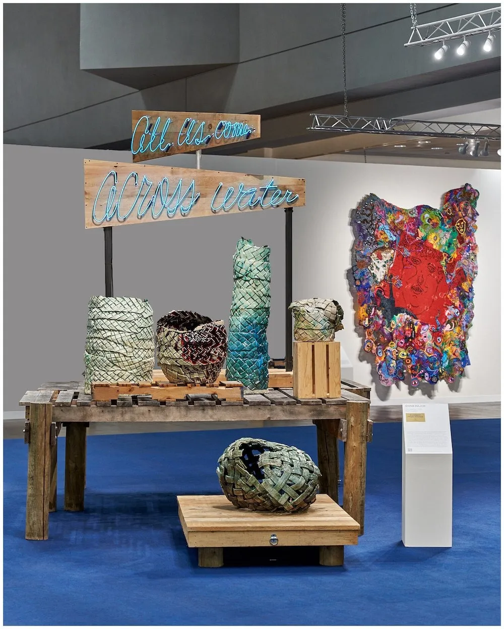 A large portion of the core galleries at the front were easily passable. The real party started at the back of the fair. In the Not-For-Profit section, I sparked a great conversation with Gavin Kennedy and the team at Fine Arts Work Center from Provincetown. It was their first time doing the fair, and their excitement was invigorating. The artist-led organization offers yearly residencies to a diverse selection of visual artists and writers from across the globe. Some highlights from their booth were artists Lisa Yuskavage, Taylor Baldwin, Arghavan Khosravi, Herman Aguirre, Anne Clare Rogers, and Amy Brener. One of their former fellows, Anina Major, whose installation, The Landing, featured in the Platform section of the fair, curated by Eugenie Tsai, had won the annual Pommery Prize of $25,000. Major is from the Bahamas and is represented by Tern Gallery in Nassau. The multimedia presentation includes ceramics inspired by her grandmother who was a Straw Market vendor. The installation includes a spinning neon sign and a dock-like platform constructed of wood palettes. Her decaying pots memorialize the dying art of straw craft and critique the systems that fuel its demise.