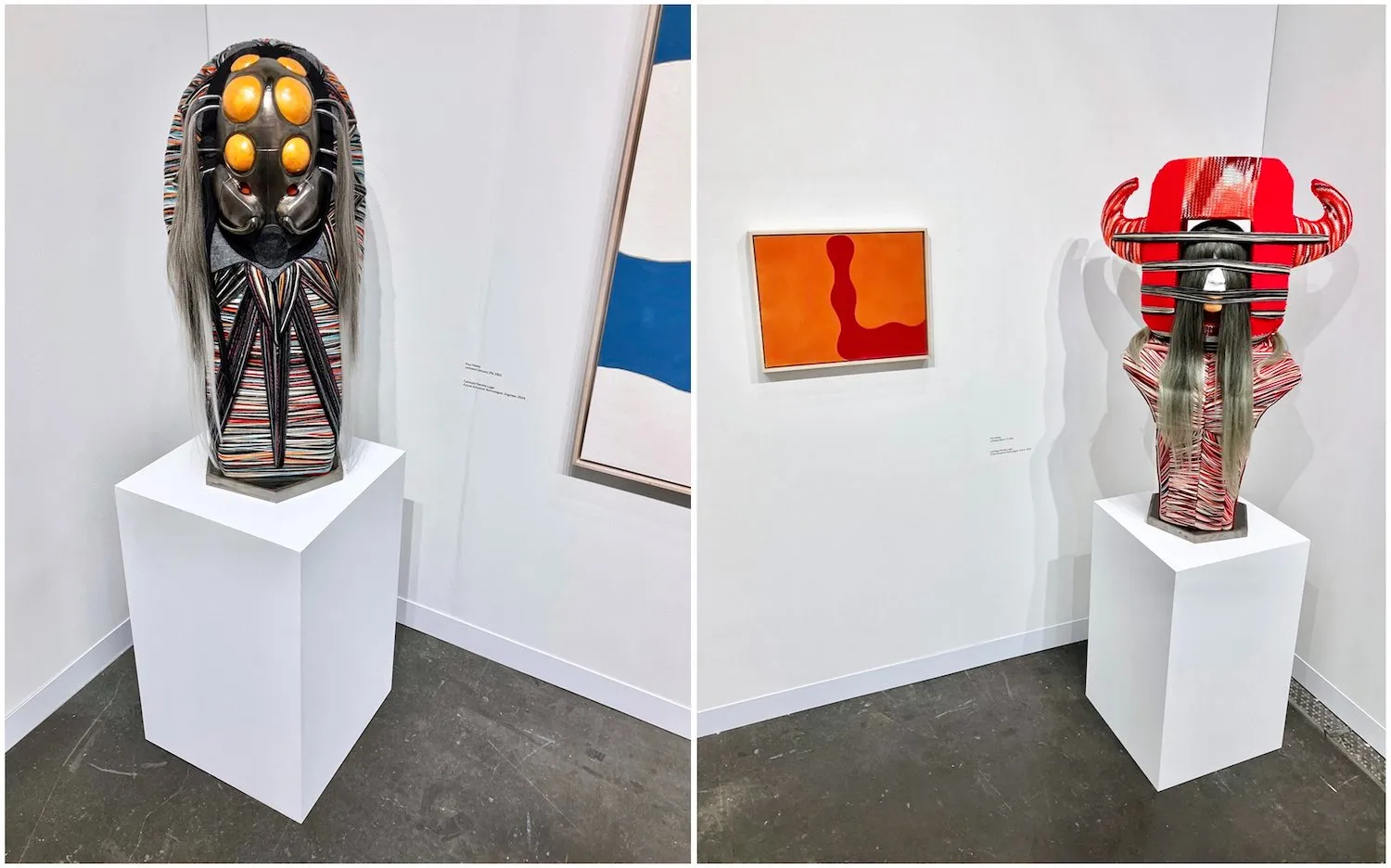 It was back to the future at Garth Greenan Gallery with their perfect combination of works by Cannupa Hanska Luger and Paul Feeley. These late works of Feeley, created just years before his death, were inspired by large-scale calendar pages given to him by his wife to keep a visual diary of his work. They are equally serene yet rhythmic, paradoxically balanced yet imperfect. His archetypal library of shapes in the form of balustrades, jacks, and rounded squares recall the past and point to the future, as with Cannupa Hanska Luger’s ongoing series, Future Ancestral Technologies. His three mixed media sculptural busts—Engineer, Guide, and Oracle—time travel through interconnected explorations of science fiction theory, storytelling, Indigenous technologies, contemporary materials, and the detritus of capitalism while addressing various phobias, landscapes, and prototypical new mythology. They emit a conjuring sense of power, playfulness, and totemic ritual in their use of animal and insect forms, yarn, and hair. I couldn’t help but fantasize about these characters in a battle dance with Rammellzee and Sun Ra. Energizing everything it comes in contact with, Luger’s work kindly pushed the view of Feeley’s paintings toward a new and invigorating vantage point.