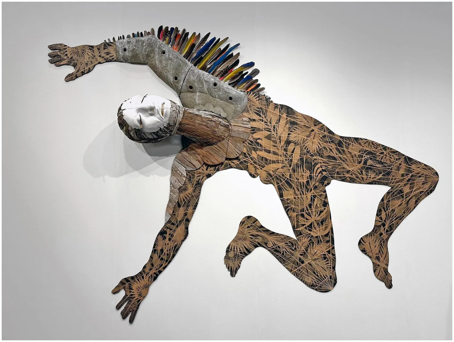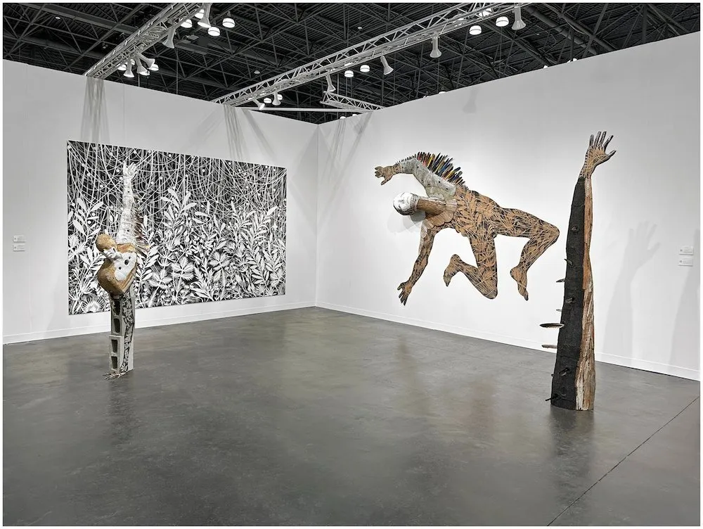 Finally, I was thrilled to see new works by Hector Dionicio Mendoza, represented by Luis De Jesus, Los Angeles. His show-stopping work delves into a world of Magical Realism, taking inspiration from oral histories, ethnobotany, and personal experiences learned from his grandfather’s practice as a fifth-generation curandero (shaman). There are references to labor and kinship with materials of the natural world—earth, tree bark, flora, and feathers and materials related to labor like corrugated cardboard, cement, glass, and cinder blocks, as well as, found and recycled objects. His ethereal forms, reaching and in flight, serenely emerge and cascade from the floor and walls, backed by a lush backdrop of black, white, and grayscale foliage and vine. The installation was perfectly balanced and staged, poetically in dialogue with both the formality of the booth and the crisscrossing ceiling rails of the Javits Center, his forms tenderly and blissfully disconnected from the cage of commerciality that all artists and dealers must find ways to navigate. It’s appropriate symbolism as The Armory Show forges ahead into its new era.