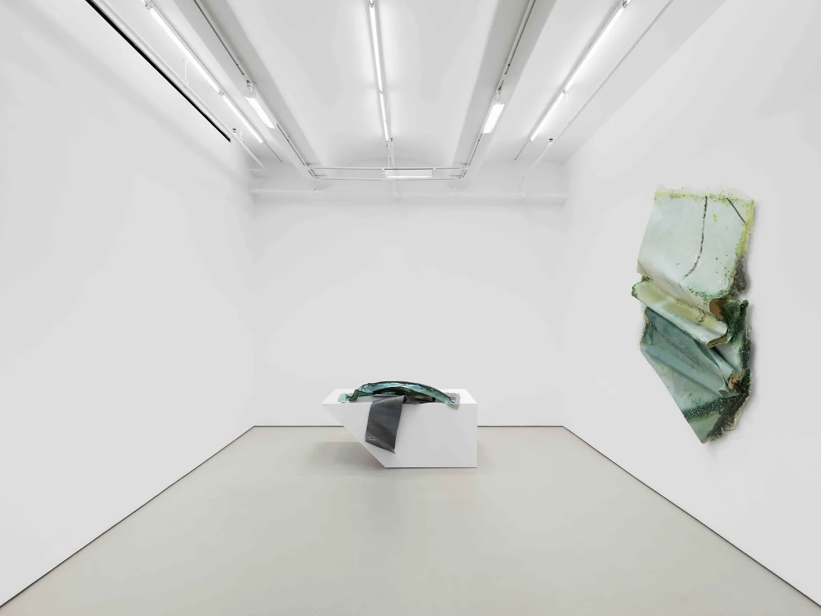 As the exhibition unravels, the viewer encounters Weston’s interest in the formal gesture of the fold, which invites the issue of excess. untitled (after the squeeze and the fuse and the lift) (2025), which spills over a pedestal cliff, presents a union between a drooping panel of lead, layers of fused mirrorpane and Solarcool breeze glass. At first glance, the amorphous form is weighted with cool sensuality. After a double take, the viewer catches their own pliant reflection, a disarming detail which Weston duly notes in the materials list: “Solarcool breeze surveillance glass.” Nearby, A misprinted aesthetic ligature touches . . . (2025) hovers like an oceanic plane, fractured and folded into elegant multiplicity. The outward creases of inkjet print jut forth in excess, joining the “squeeze” with Nicole Fleetwood’s concept of “excess flesh.” Concerning the United States’s cultural obsession with racialized visibility, “excess flesh” attends “to ways in which black female corporeality is rendered as an excessive overdetermination and as overdetermined excess.”[1] In Weston’s billowing sculpture, excess is presented not necessarily as a re-inscription of corporeality, but as a manipulation of material that leaves the viewer’s gaze to linger on the surface. The frayed edges of crushed, tempered glass drift towards an eventual disappearance, where, even in the absence of a body, the fold becomes a figuration of such visual constraint and scrutiny.